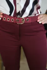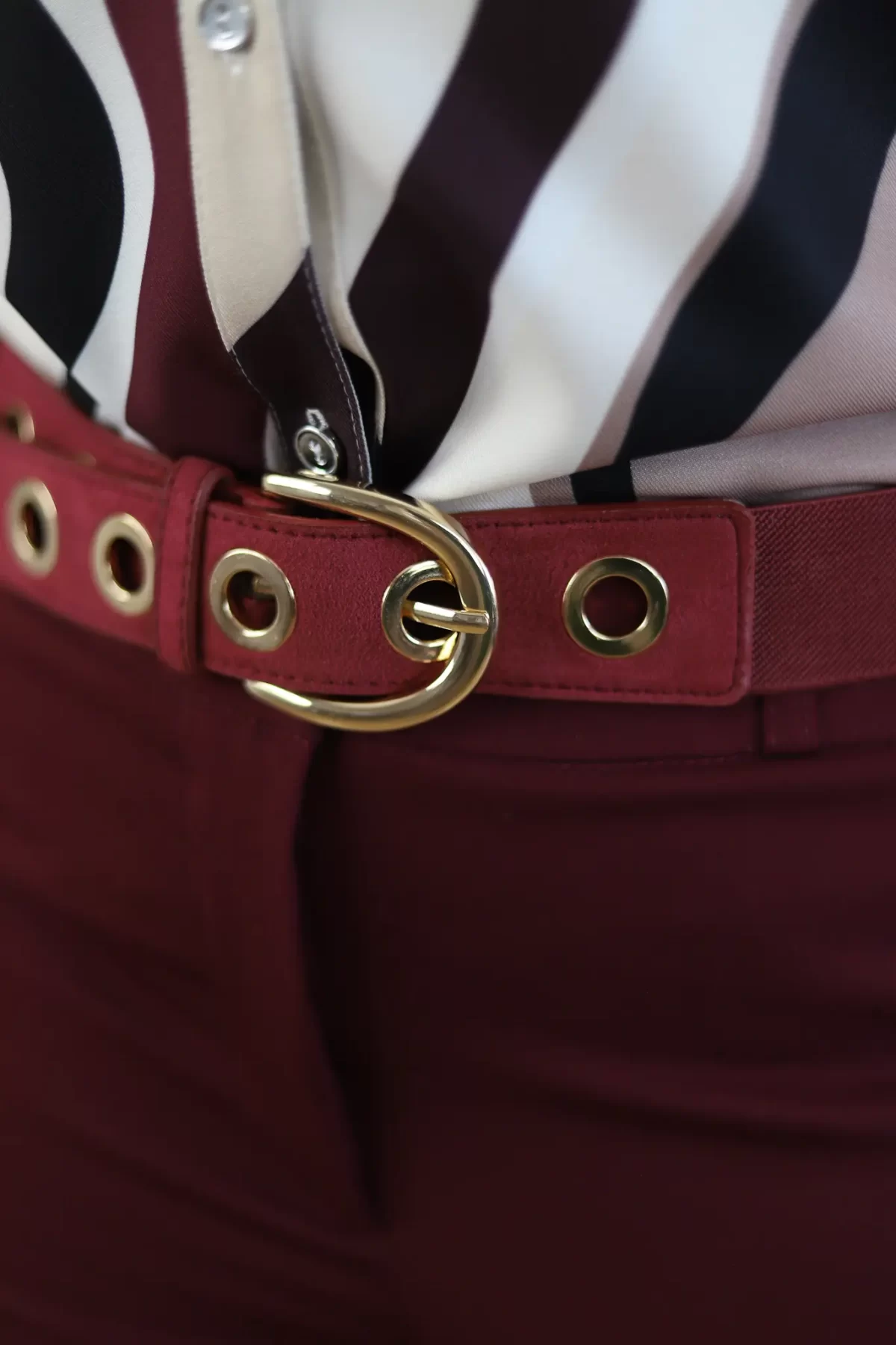 Pasek, który pełni rolę wyraźnego dodatku do stylizacji. Charakterystyczną cechą są duże, okrągłe, złote metalowe oczka (przelotki), umieszczone w równych odstępach wzdłuż paska. Pasek jest zapinany na prostą, owalną, złotą klamrę. Połączenie ciemnego brązu ze złotymi elementami nadaje mu elegancki, ale też odważny i nowoczesny charakter.