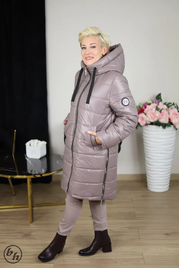 Kamizelka o długości midi, pikowana w kolorze beżowym. Posiada kaptur z sznurkami do ściągania. Z przodu ma zapięcie na zatrzaski w złotym kolorze. Na wysokości bioder znajdują się dwie naszyte kieszenie z klapami zapinanymi na zatrzaski. Kamizelka idealna na chłodniejsze dni. Skład: 100% poliester