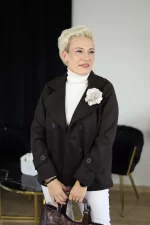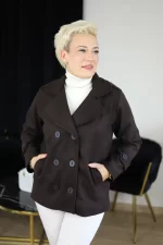 Krótki płaszcz to uniwersalny element każdej garderoby, idealny na chłodniejsze dni. Jego dwurzędowe zapięcie na kontrastujące guziki nadaje mu elegancki i ponadczasowy charakter. Płaszcz ma szerokie klapy a jednocześnie stylowego wyglądu. Dodatkowo, ozdobne guziki na mankietach oraz dwie boczne kieszenie to praktyczne detale, które podnoszą jego funkcjonalność.