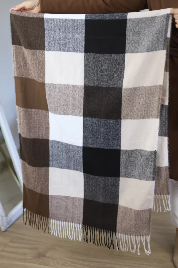 Szal w ponadczasowy, elegancki wzór w kratę, utrzymany w stonowanych, harmonijnych kolorach. Dominują tu odcienie granatu, bieli, beżu i jasnego błękitu. Krata składa się z dużych, równomiernych kwadratów, co nadaje szalowi klasyczny i uporządkowany wygląd. Brzegi szala są wykończone rzędami luźnych frędzli w kolorze beżowym i białym, co dodaje mu swobodnego i stylowego charakteru. Skład: 50% bawełna 50% wiskoza