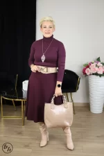 Elegancka sukienka idealna na specjalne okazje, wieczorne wyjścia lub uroczyste spotkania. Łączy w sobie klasyczny, dopasowany fason z nowoczesnymi i intrygującymi detalami. Strukturalny, delikatnie błyszczący materiał z subtelną fakturą który pięknie odbija światło, nadając kreacji wieczorowego charakteru. Rękawy długie, wykonane z lżejszego, przezroczystego szyfonu w identycznym lub zbliżonym kolorze fioletu.