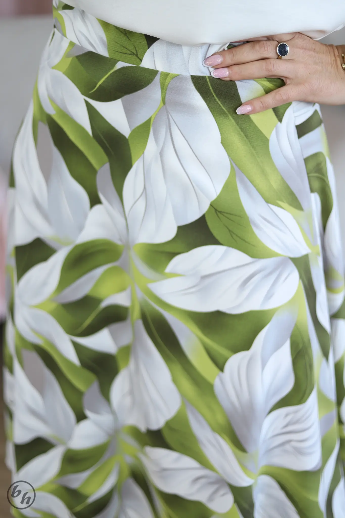 Stylowa spódnica midi zachwyca świeżym, roślinnym motywem w odcieniach soczystej zieleni i bieli, który nadaje sylwetce lekkości i wiosennej energii. Wykonana z niezwykle miękkiej i gładkiej tkaniny typu masełko, oferuje niezrównany komfort noszenia oraz idealne dopasowanie do figury. Lekko rozkloszowany fason z wysokim stanem pięknie podkreśla talię i swobodnie opływa nogi, zapewniając pełną swobodę ruchów. To idealna propozycja dla kobiet szukających połączenia wygody z wyrazistym, kobiecym designem, który świetnie sprawdzi się zarówno w codziennych, jak i bardziej eleganckich zestawieniach.