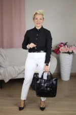 Stylowa, dopasowana koszula w kolorze czarnym to niezbędny element kobiecej garderoby. Wykonana z wysokiej jakości materiału, zapewnia komfort noszenia przez cały dzień – zarówno w pracy, jak i na specjalne okazje. Posiada klasyczny kołnierzyk i zapięcie na guziki, które dodają całości elegancji. Świetnie prezentuje się zarówno wpuszczona w spodnie lub spódnicę, jak i noszona luźno.