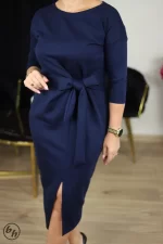Sukienka w kolorze granatowym o fasonie kopertowym. Wykonana z materiału typu „masełko”, jest przyjemna w dotyku i komfortowa w noszeniu. Sukienka ma okrągły dekolt i rękawy 7/8. Z przodu znajduje się ozdobne wiązanie, które podkreśla talię, oraz rozcięcie na dole, dodające sukience lekkości i subtelności.