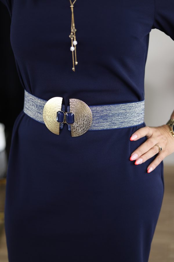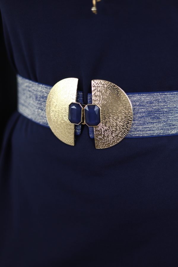 Elegancki pasek damski z elastyczną taśmą która pięknie podkreśla talię. Zapinany jest na efektowną klamrę w kolorze złota, w kształcie dwóch półokręgów o młotkowanej fakturze. Środek zdobią granatowe kamienie w geometrycznej oprawie, dodające całości szykownego charakteru. To idealny dodatek do sukienek i tunik, który nada stylizacji klasy i wyjątkowego blasku.