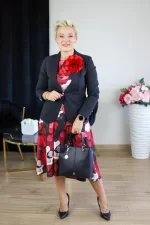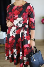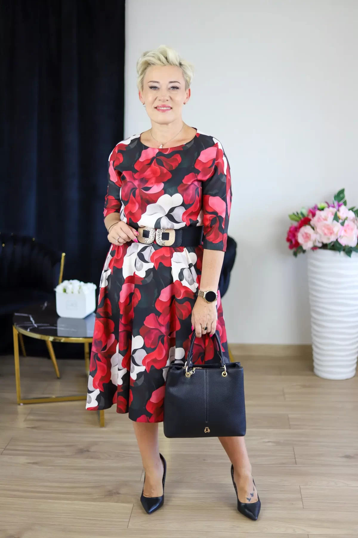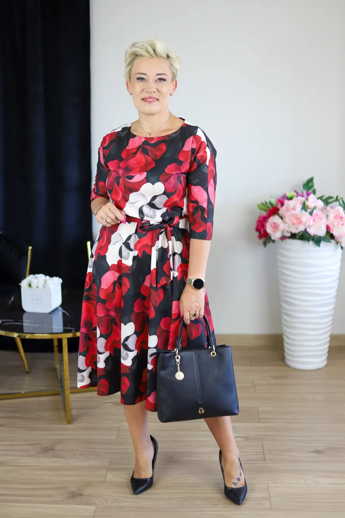 Kwintesencja kobiecości i stylu. Wykonana z lekkiego, zwiewnego materiału, który pięknie układa się w ruchu. Zjawiskowy, duży kwiatowy wzór w odcieniach czerwieni, bieli i różu na czarnym tle nadaje jej wyrazistego charakteru. Sukienka posiada dekolt w łódkę, który subtelnie odsłania szyję. Długość 3/4 rękawów jest idealna na wiele okazji, a dołączony pasek z tego samego materiału podkreśla talię, nadając sylwetce pięknych proporcji. Rozkloszowany dół sukienki dodaje jej lekkości i romantyzmu. To idealny wybór na specjalne wyjścia, jak i na co dzień.