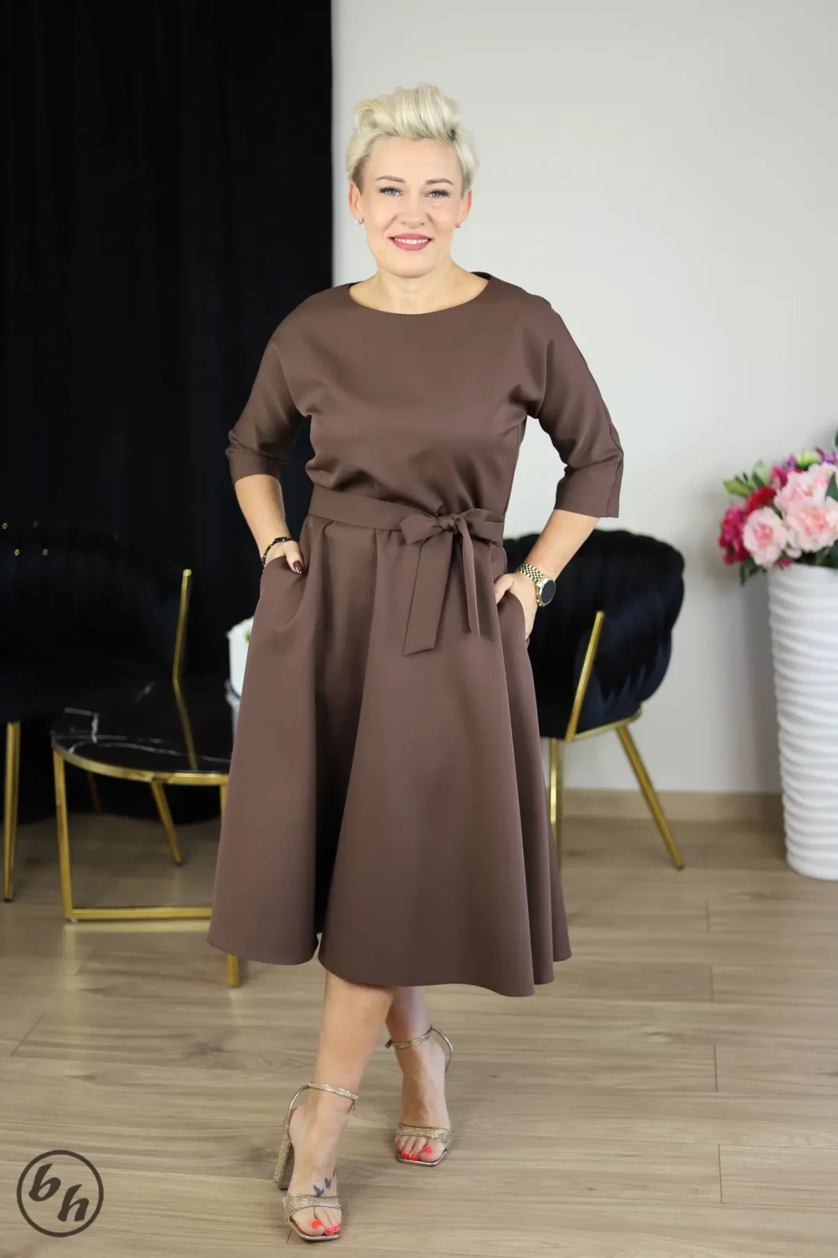 Sukienka ma dopasowaną górę i rozkloszowany dół, który sięga mniej więcej do połowy łydki (długość midi). Rękawy o długości 3/4, co jest uniwersalnym i eleganckim rozwiązaniem. Sukienka jest w jednolitym kolor, który jest elegancki i stonowany. Kluczowym elementem jest wiązany pasek z tego samego materiału, który pozwala na idealne dopasowanie w talii i dodaje uroku. Sukienka posiada również praktyczne kieszenie wszyte w szwy na wysokości bioder.