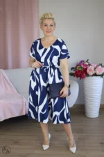 Sukienka o długości midi model charakteryzuje się luźnym krojem z dekoltem w serek i krótkimi rękawami, co zapewnia wygodę i swobodę ruchów. W pasie znajduje się elastyczna gumka, która subtelnie podkreśla talię, dopasowując sukienkę do sylwetki. Sukienkę zdobi przyciągający wzrok, dynamiczny wzór w kontrastujących kolorach białym i granatowym.