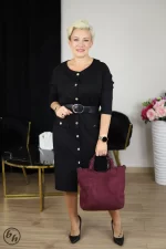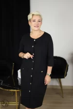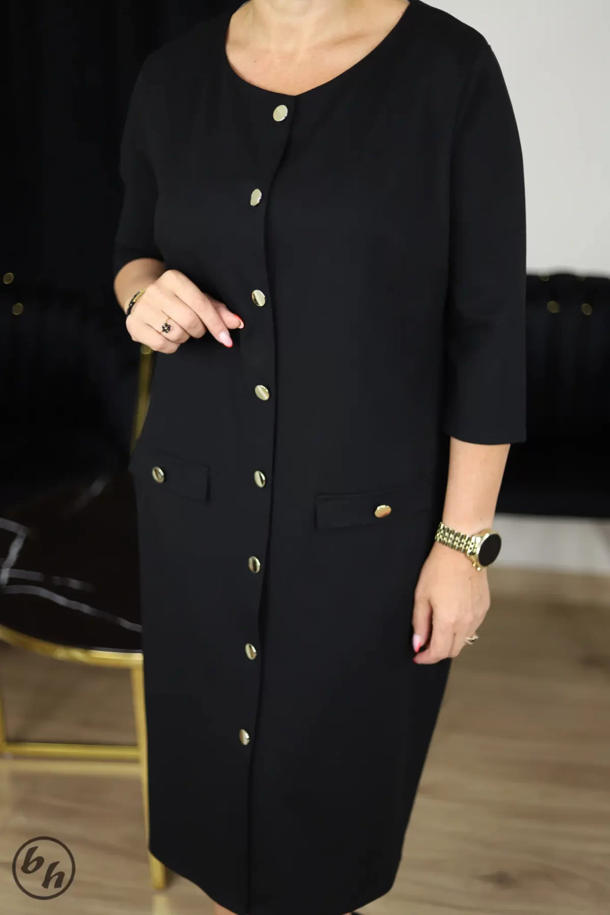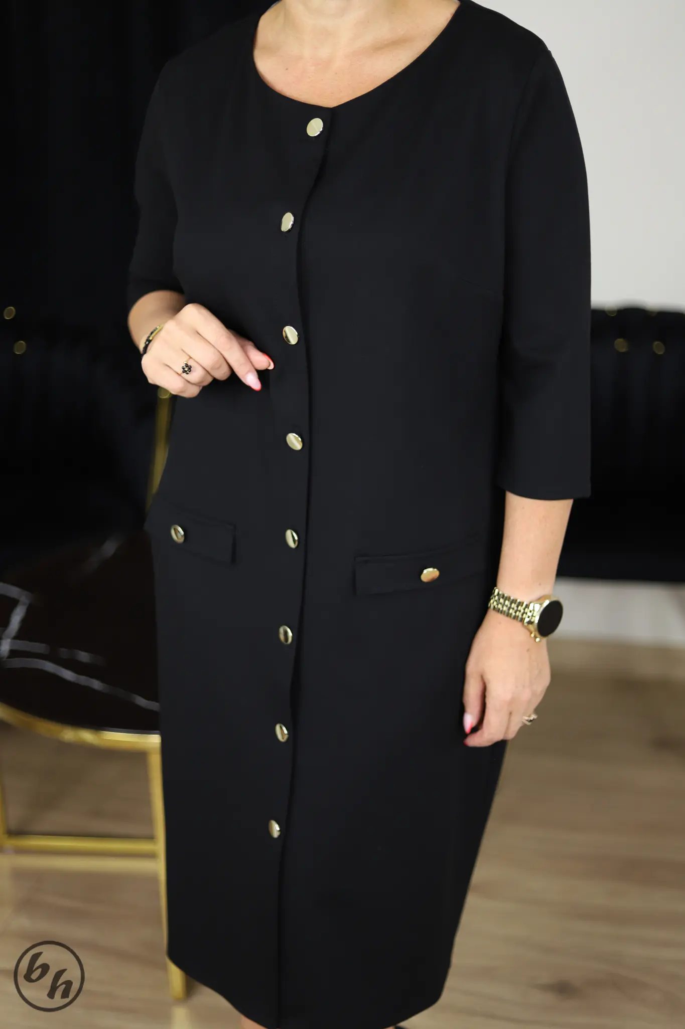 Sukienka z ozdobnymi złotymi guzikami. Odkryj kwintesencję ponadczasowej elegancji! Ta czarna sukienka o prostym, klasycznym kroju to absolutny „must-have” w każdej garderobie. Jej minimalizm przełamany jest efektownymi detalami, które nadają jej luksusowego charakteru. To sukienka wielozadaniowa! Z łatwością stworzysz z nią zarówno profesjonalny look biznesowy, jak i elegancki strój na wieczorne wyjście czy rodzinne uroczystości.