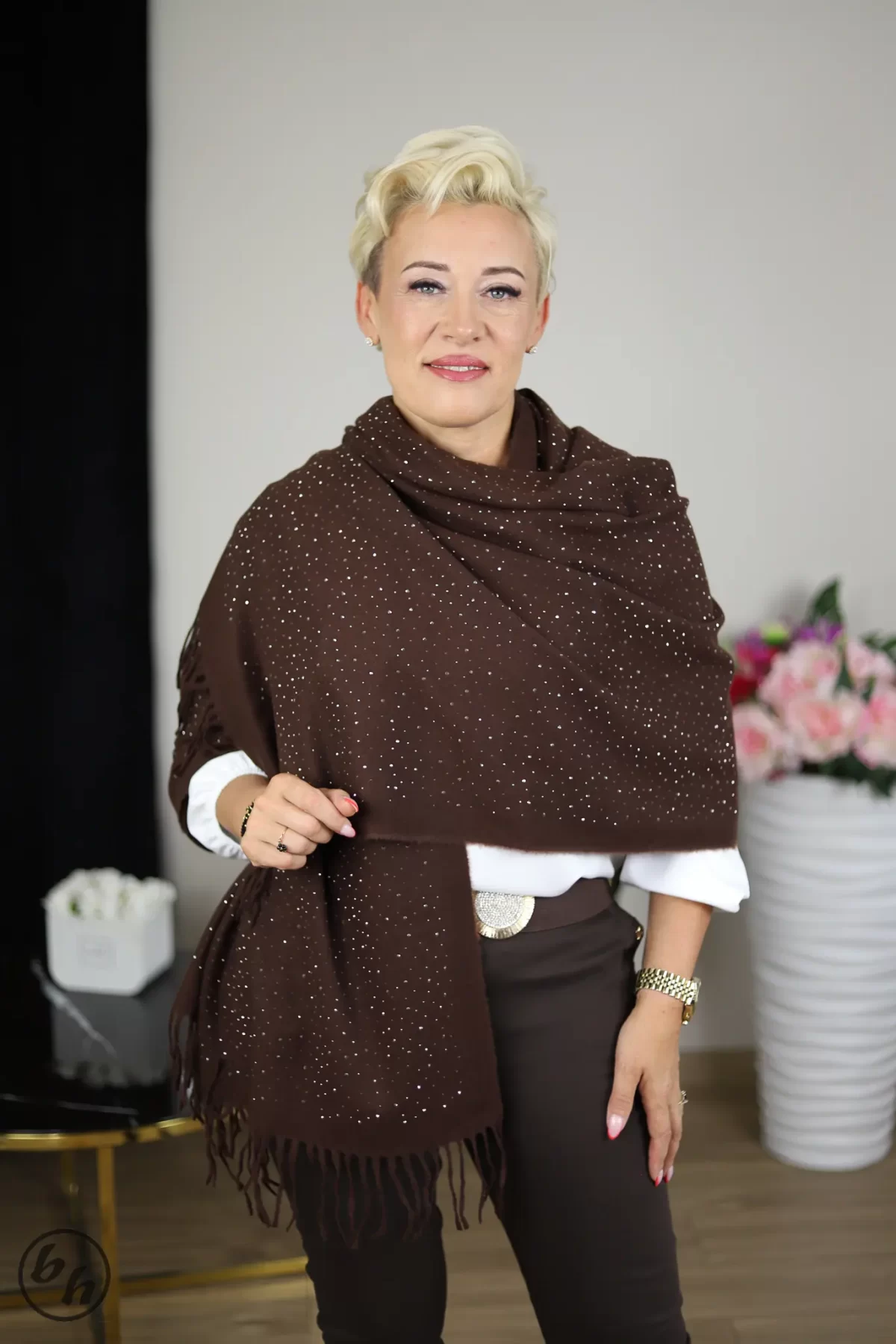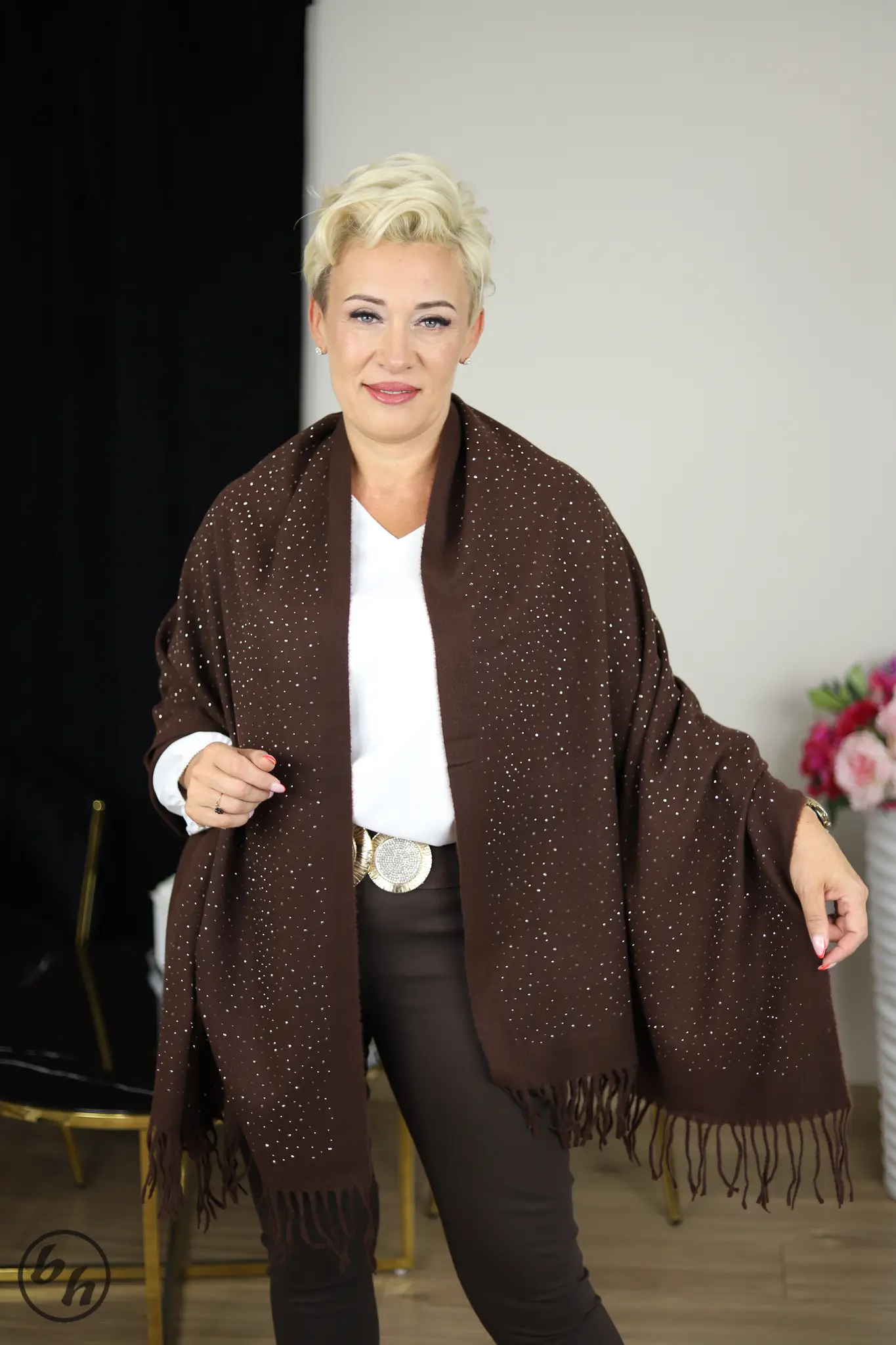 Elegancki Szal z Błyszczącym Akcentem – Idealny Dodatek na Każdą Okazję! Ten wyjątkowy szal to połączenie ciepła, komfortu i efektownego designu. Jest to duży, prostokątny model zapewniający maksymalny komfort noszenia i pozwalający na wiele opcji stylizacyjnych – od luźnego narzucenia na ramiona po szczelne owinięcie szyi.