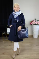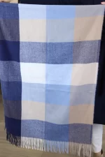 Szal w ponadczasowy, elegancki wzór w kratę, utrzymany w stonowanych, harmonijnych kolorach. Dominują tu odcienie granatu, bieli, beżu i jasnego błękitu. Krata składa się z dużych, równomiernych kwadratów, co nadaje szalowi klasyczny i uporządkowany wygląd. Brzegi szala są wykończone rzędami luźnych frędzli w kolorze beżowym i białym, co dodaje mu swobodnego i stylowego charakteru.