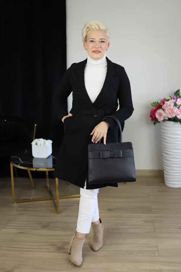 Elegancki płaszcz damski w klasycznym wydaniu, idealny na chłodniejsze dni. Wykonany z przyjemnego w dotyku materiału, świetnie układa się na sylwetce. Model posiada pasek w talii, który podkreśla kobiecą figurę i pozwala na regulację dopasowania. Klasyczny kołnierz dodaje całości szyku, a praktyczne kieszenie zwiększają wygodę noszenia. Płaszcz doskonale sprawdzi się zarówno w codziennych, jak i bardziej eleganckich stylizacjach.