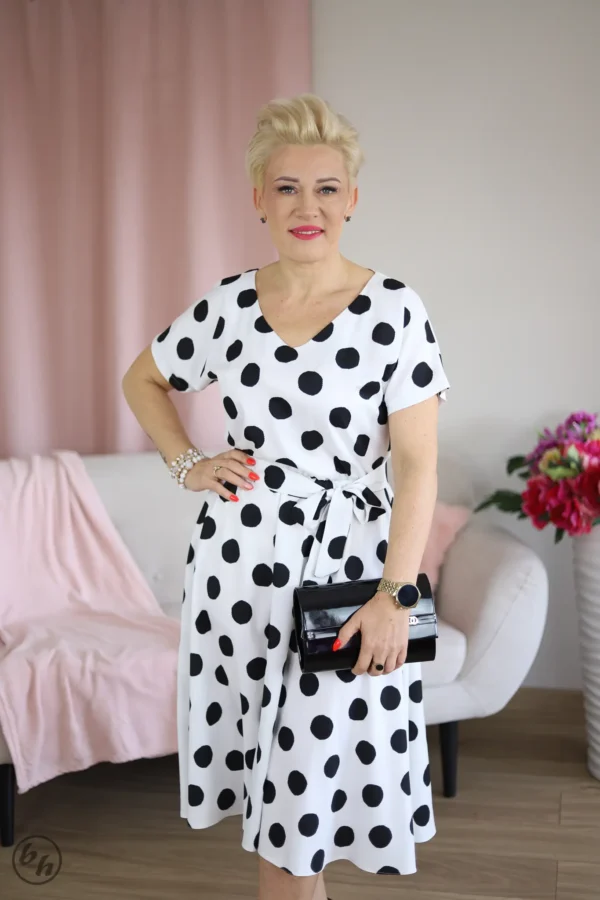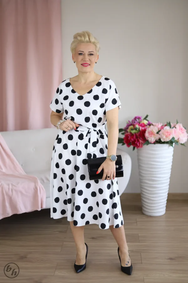 Elegancka sukienka o fasonie „motylek”. Najbardziej charakterystycznym elementem tego modelu są krótkie, fantazyjne rękawki z delikatnymi zakładkami, które miękko układają się na ramionach, przypominając skrzydełka motyla. Dekolt wycięty w subtelny serek optycznie wydłuża szyję i dodaje sukience lekkości. W talii znajduje się materiałowy pasek w tym samym kolorze, który pozwala na idealne dopasowanie kreacji do sylwetki i efektowne podkreślenie wcięcia. Dół sukienki o długości midi swobodnie opływa nogi, zapewniając elegancję przy każdym ruchu.