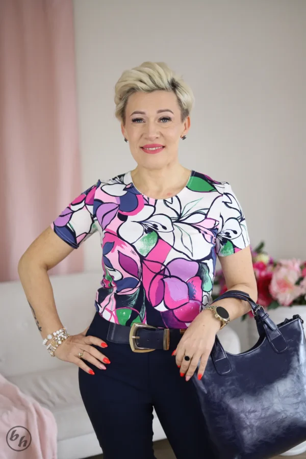 Dominujące odcienie amarantu, głębokiego fioletu i soczystej zieleni na białym tle tworzą wyrazistą kompozycję, która natychmiast rozświetla cerę i dodaje całej stylizacji świeżości. Krótki rękaw oraz klasyczny, okrągły dekolt sprawiają, że bluzka jest niezwykle uniwersalna i praktyczna. Miękki, elastyczny materiał perfekcyjnie dopasowuje się do sylwetki. To inwestycja w element garderoby, który ożywi Twoją szafę i sprawi, że każdego dnia będziesz wyglądać na wypoczętą i pełną energii.