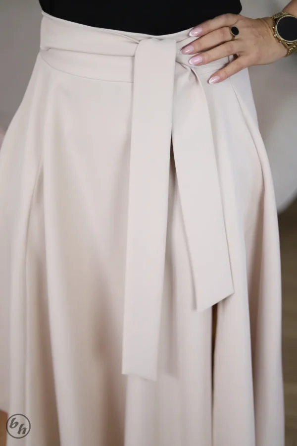 Stylowa propozycja o długości maxi, która wyróżnia się rozkloszowanym fasonem pięknie układającym się w ruchu. Materiał swobodnie opada ku dołowi, tworząc efektowne, miękkie fale, które nadają sylwetce lekkości i elegancji. Wysoki stan spódnicy został wyraźnie podkreślony szerokim, gładkim paskiem z klasyczną, prostokątną klamrą, który znajduje się w zestawie i pozwala na idealne dopasowanie całości do talii.