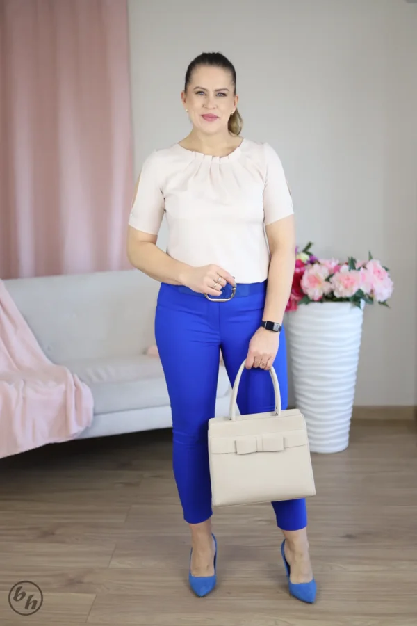 Definicja subtelności, jej delikatny odcień pięknie rozświetla cerę, a klasyczny dekolt w serek zgrabnie wysmukla linię szyi, nadając sylwetce lekkości. Największym atutem tego modelu są szerokie, eleganckie mankiety zdobione rzędem lśniących, złotych guzików, które pełnią rolę subtelnej biżuterii i dodają całości luksusowego charakteru. To fason, który z łatwością odnajdzie się w biurowym dress codzie.